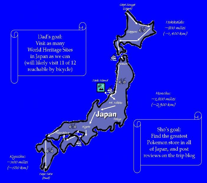 We rode from Cape Soya at the northern-most tip of Hokkaido to Cape Sata at the southern-most tip of Kyushu. Before leaving, we mapped out a possible route (see below), but made changes once we were under way based on traffic, terrain, suggestions from locals, whim and Sho's mood. In the end, we visited 9 World Heritage Sites and covered approximately 2,500 miles or 4,000 kilometers.
