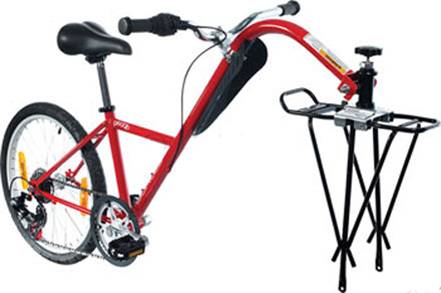 Sho rode a Burley Piccolo trailercycle, attached to the rear rack of the Trek 520. Its name is Flaming Tiki: